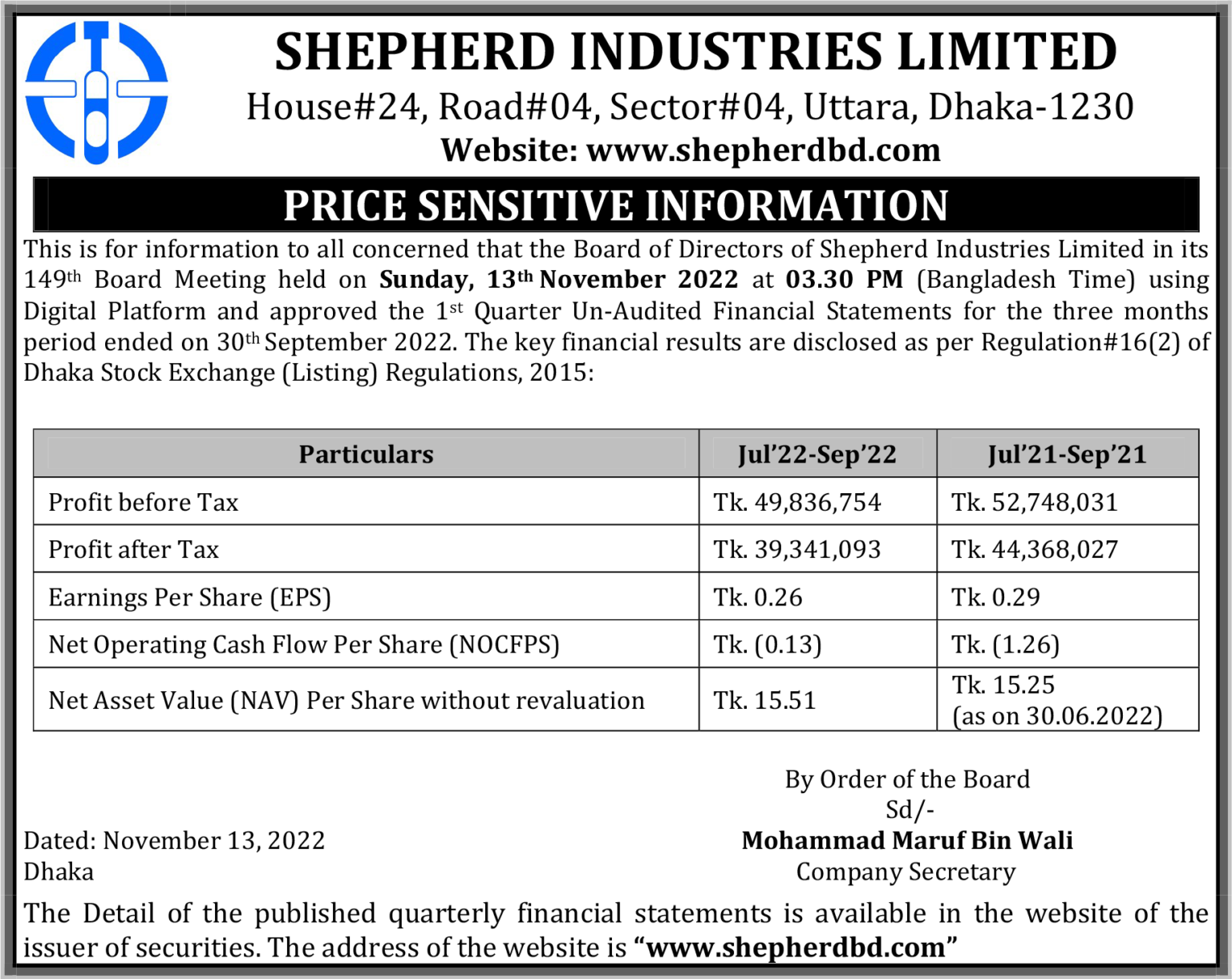 1st Quarter (Un-Audited) Financial Statements as on September 30, 2022