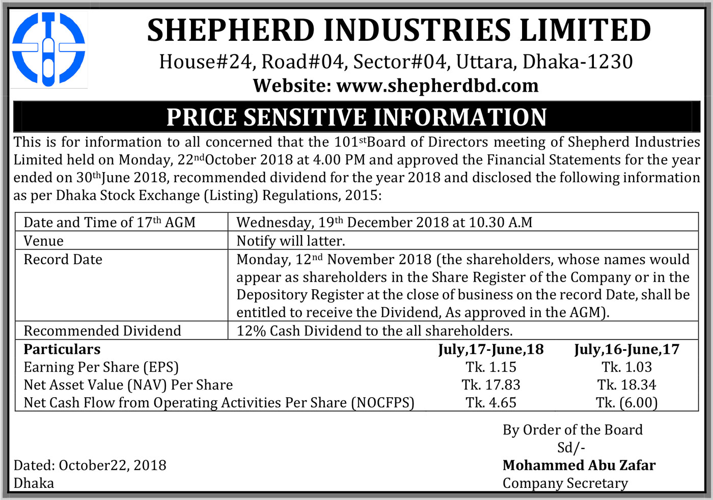 Price sensitive Information 2nd Quarter 31 December 2018